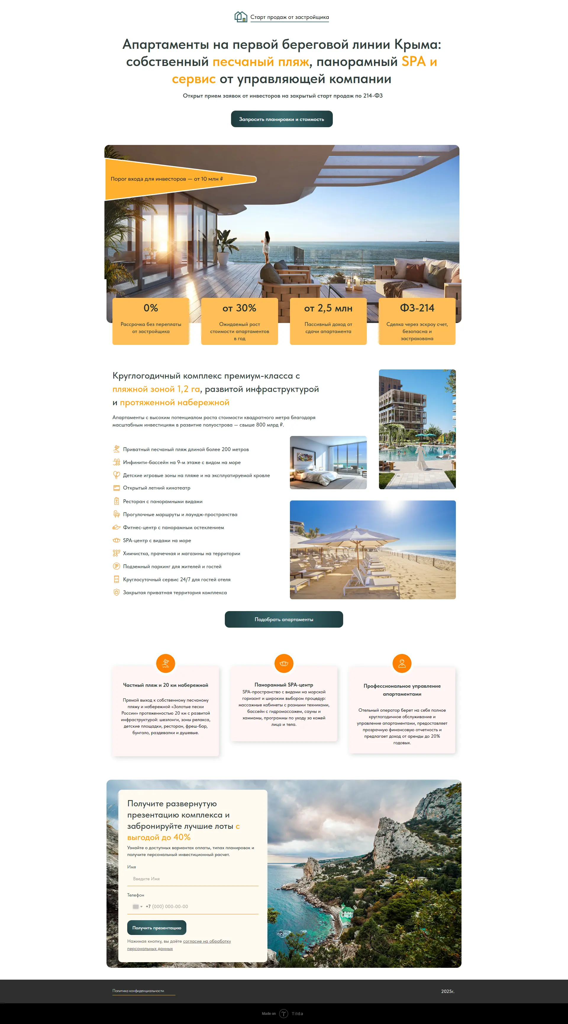 Нужен был лендинг под закрытый старт продаж инвест-апарт-отеля премиум-класса на первой береговой линии в Крыму: собственный песчаный пляж, инфинити-бассейн и панорамный SPA-центр, управляемый отельным оператором. На одной странице мы собрали ключевые аргументы для инвесторов — первая линия, инфраструктура, юридическая защита сделки по 214-ФЗ, потенциальный рост стоимости и понятный сценарий заявки на подбор планировок и получение презентации с инвест-расчётом без лишней навигации.
