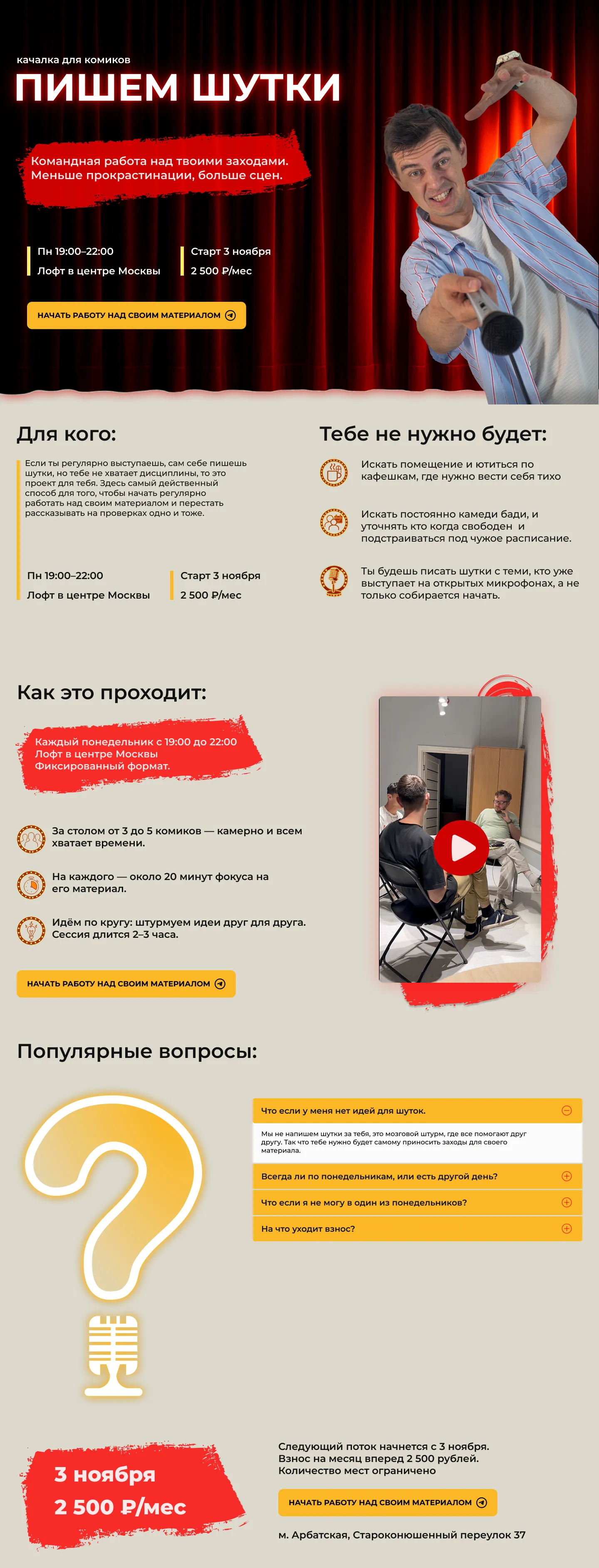 Hero: сцена с красными кулисами, свет справа, крупный H1 «Пишем шутки», подзаголовок о командной работе и бейджи: Пн 19:00–22:00 • Лофт в центре Москвы • Старт 3 ноября • 2 500 ₽/мес.